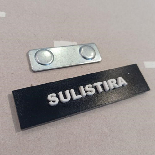 Sebagai jasa laser cutting Surabaya yang sudah berpengalaman dari tahun 2014, menurut Laserfox, name tag dengan perekat magnet satu ini cukup unik. Karena huruf timbulnya merupakan hasil dari laser cutting akrilik, maka hal inilah yang membuat name tag satu ini cukup berbeda. Membuat nama karyawan anda jadi lebih menonjol, name tag akrilik timbul ini juga memberikan kesan simpel dan elegan saat digunakan untuk karyawan anda.