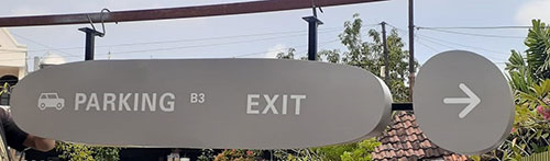 Seperti portfolio Laserfox berikut. Dengan desain yang sederhana namun informatif, signage ini menyediakan panduan yang jelas bagi pengunjung untuk menemukan lokasi area parkir serta pintu keluar yang diinginkan. Signage tersebut menggunakan simbol-simbol yang mudah dipahami dan teks yang terbaca dengan jelas, sehingga meminimalkan kemungkinan kebingungan bagi pengunjung. Kehadirannya memberikan keyakinan kepada pengunjung bahwa mereka dapat dengan mudah menavigasi lingkungan yang mungkin rumit, sementara juga mencerminkan perhatian terhadap pengalaman pengguna yang baik.